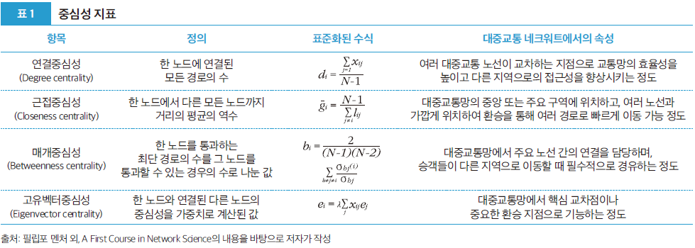 이 분석을 위하여 전국에 구축된 모든 대중교통 노선을 500m×500m 격자로 맵핑하여 격자를노드로, 노드 간 연결되는 노선을 링크로 구성된 대중교통 네트워크를 구축하였다. 단, 하나의 격자로부터 환승 없이 직결로 연결된 격자는 별도의 링크로 연결하여 격자 간 직결 노선이 존재하는 경우와 환승을 해야 하는 경우를 명확하게 분리해 직결 노선의 중요성을 부각시켜 네트워크를 구축하였다.