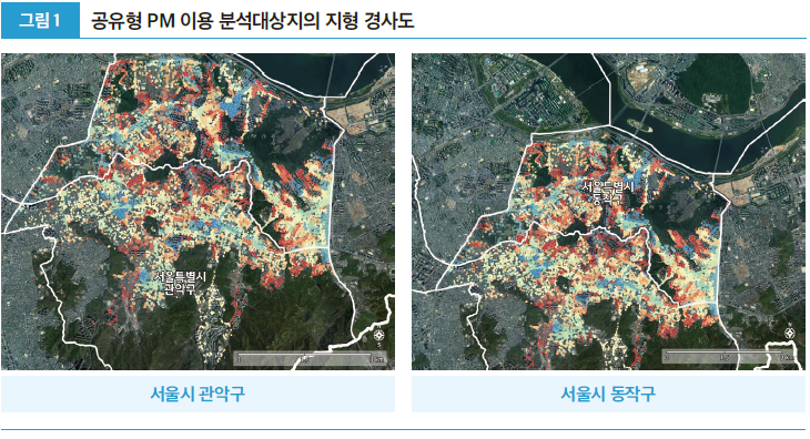 공유형 PM(Personal Mobility) 데이터를 활용하여 대여 및 반납지점의 고도(m)와 경사도(°)를 기준으로 접근 취약지역을 분석하였다. 서울 관악구(보라매동, 청림동), 동작구(상도동)이 접근 취약지역으로 분류되었다. 이 지역은 대체적으로 평균 고도가 높고, 경사도가 가파른 지역으로 공유 PM 이용률이 높았다.