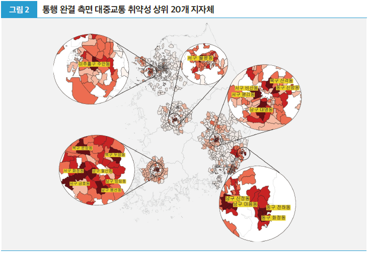 "대중교통 접근 취약성 분석은 대중교통수단까지 접근하는 데 불편을 초래하는 요인과 지역을 도출하는 것이다."