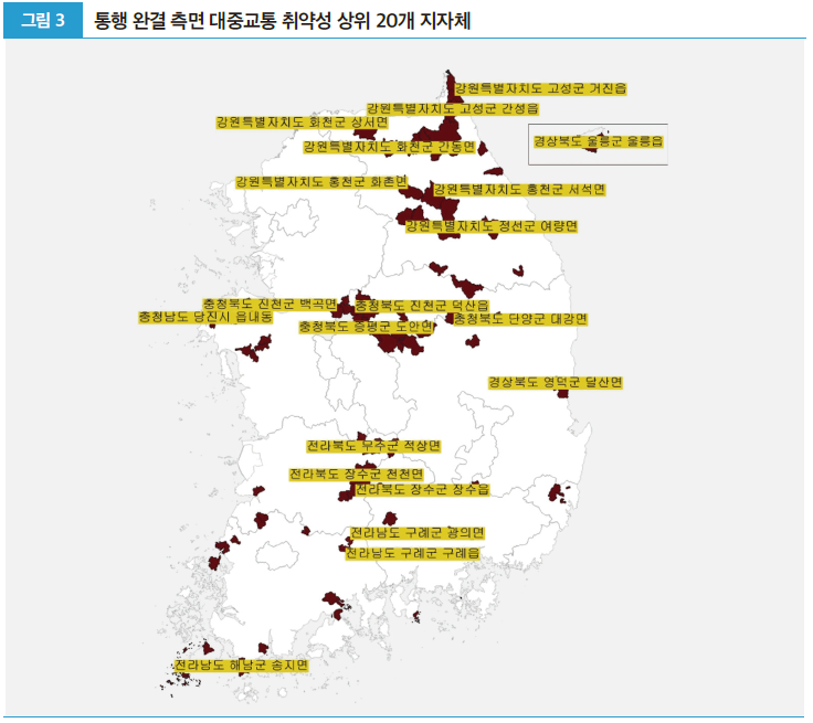 "강원특별자치도, 전라북도, 전라남도, 충청북도 등의 도 지역에서통행 완결성이 가장 낮아 대중교통 접근성이 현저히부족한 것으로 나타났다."
