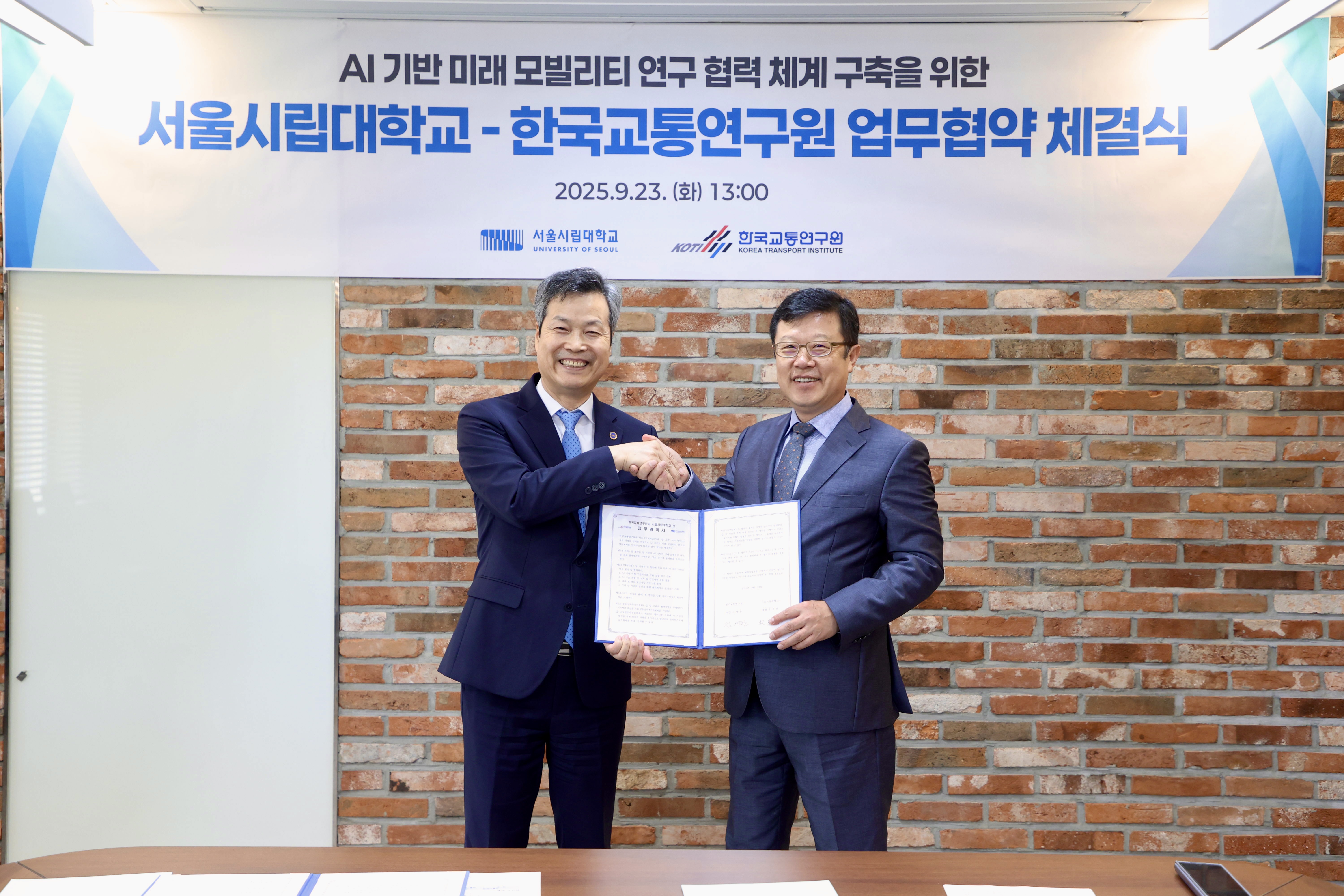 ▲(사진 왼쪽부터) 원용걸 서울시립대학교 총장, 김영찬 한국교통연구원 원장