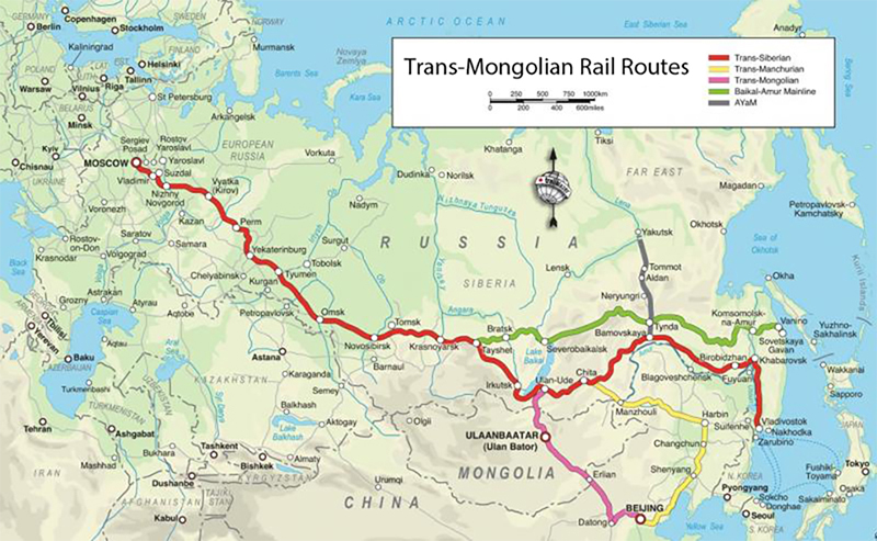 - 현재 중국의 천진항을 몽골횡단철도의 관문으로 사용하고 있으며 베이징, 몽골의 울란바토르, 수흐바토르역(몽-러 국경역), 나우시키역(러-몽 국경역)을 경유하여 러시아의 울란우데역에서 시베리아횡단철도에 연계되어 유럽의 주요도시로 연결됨